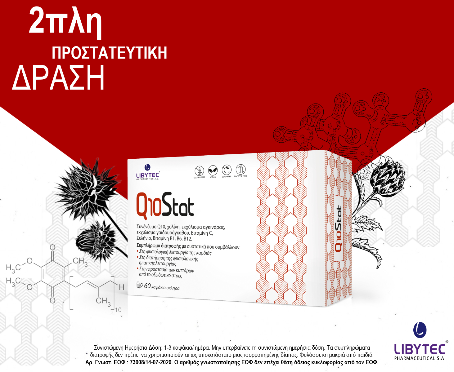 Η εταιρεία Libytec Φαρμακευτική ΑΕ, είναι στην ευχάριστη θέση να σας ανακοινώσει την κυκλοφορία του νέου της προϊόντος Q10STAT. Το Q10Stat είναι ένας καινοτόμος συνδυασμός που περιέχει CoQ10, σελήνιο, χολίνη, εκχύλισμα από αγκινάρα και γαϊδουράγκαθο και βιταμίνες C, Β1, Β6, και Β12. Είναι ειδικά σχεδιασμένο για την προστασία Καρδίας και ήπατος.